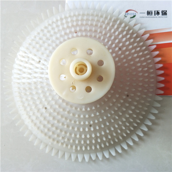 旋混式曝气器是由连接接咀,旋混芯分流圈、夹层扩散齿罩、扩散倒齿罩,空气干管、空气支管、水平调节支架、空气排污装置、等主要部件组成,空气由配气管道进入曝气器,气流会使橡胶空气止回阀产生上下变隙运动,再通过分流圈的扩散内齿、夹层扩散齿罩上下齿、倒齿扩散罩对上浮运动的气泡起多重碰撞破碎的动力扩散的作用。曝气器与空气支管的连接是采用市场上通用的标准粗螺纹连接。